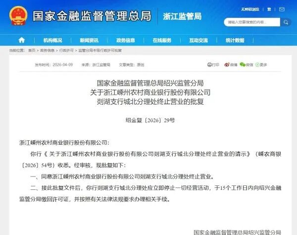 近日,國(guó)家金融監(jiān)督管理總局浙江監(jiān)管局網(wǎng)站發(fā)布了一則《關(guān)于浙江嵊州農(nóng)村商業(yè)銀行股份有限公司剡湖支行城北分理處終止?fàn)I業(yè)的請(qǐng)示》。內(nèi)容如下:浙江嵊州農(nóng)村商業(yè)銀行股份有限公司:你行《關(guān)于浙江嵊州農(nóng)村商業(yè)銀行股