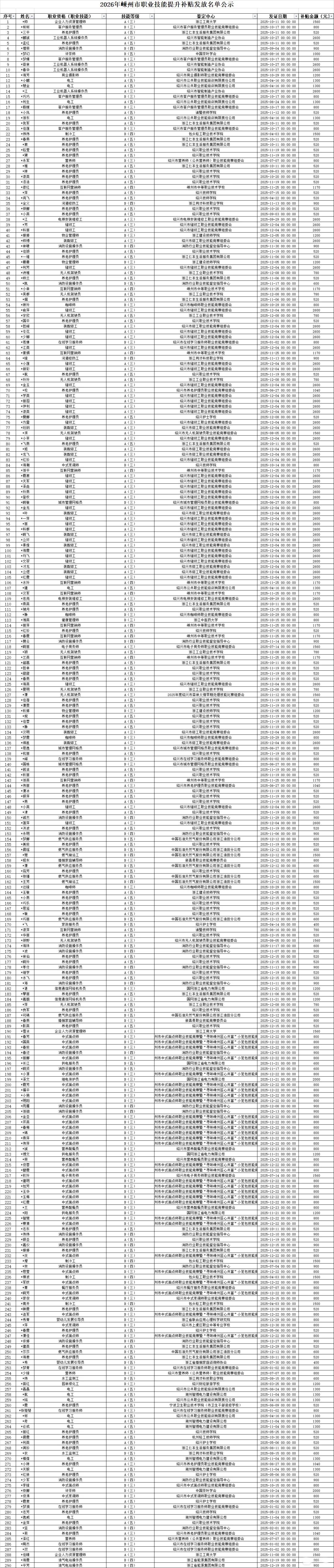 附件:2026年1月嵊州市職業(yè)技能提升補(bǔ)貼發(fā)放名單公示