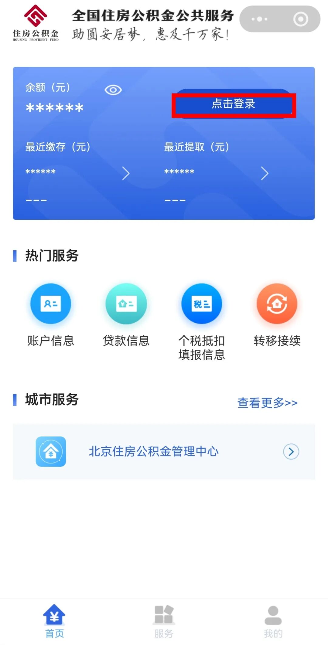 2. 進(jìn)入“全國(guó)住房公積金公共服務(wù)”小程序,在首頁(yè)點(diǎn)擊“點(diǎn)擊登錄”,填寫個(gè)人信息并完成人臉識(shí)別后登錄。