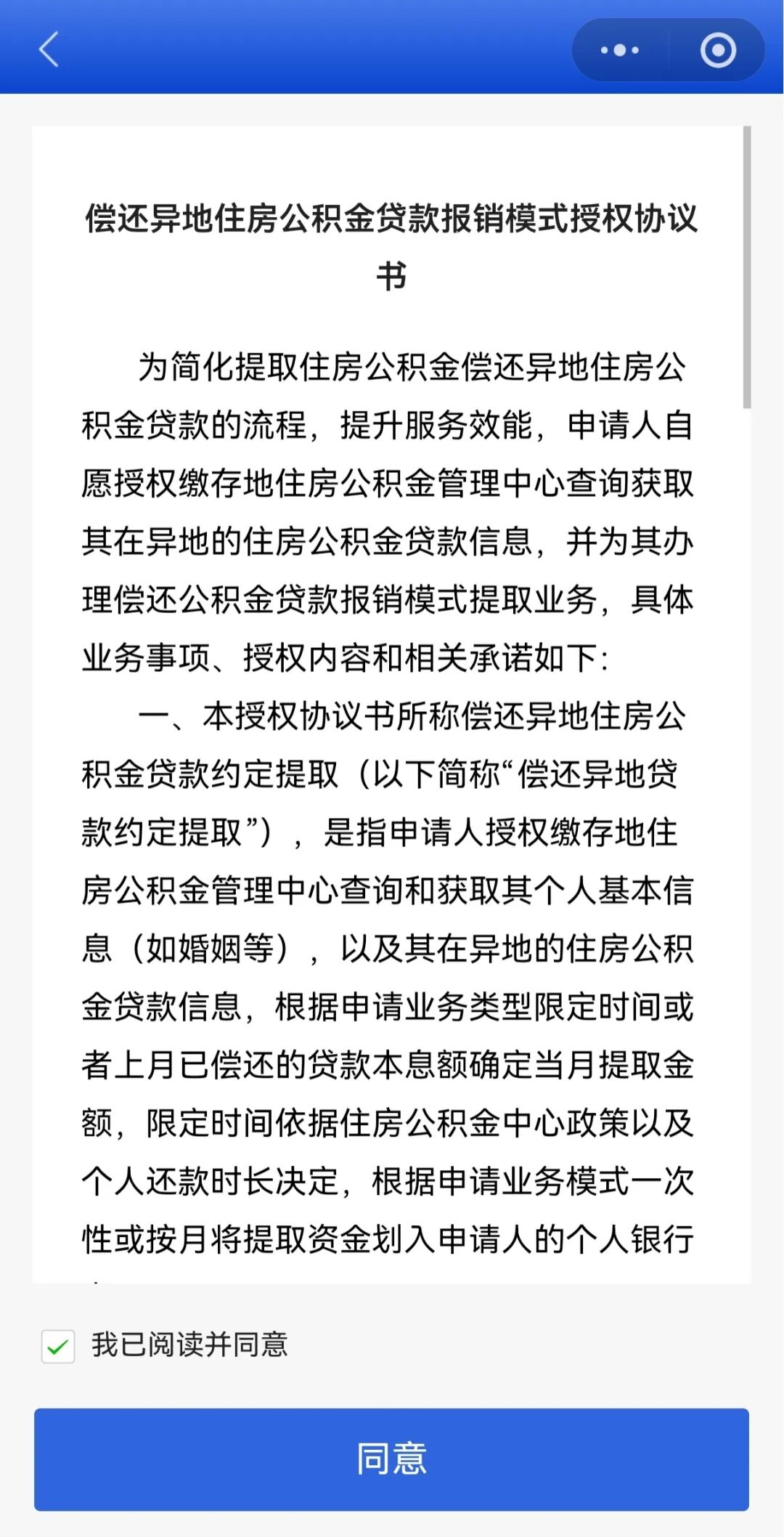 4. 仔細(xì)閱讀并同意《償還異地住房公積金貸款報(bào)銷模式授權(quán)協(xié)議書》。