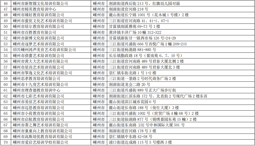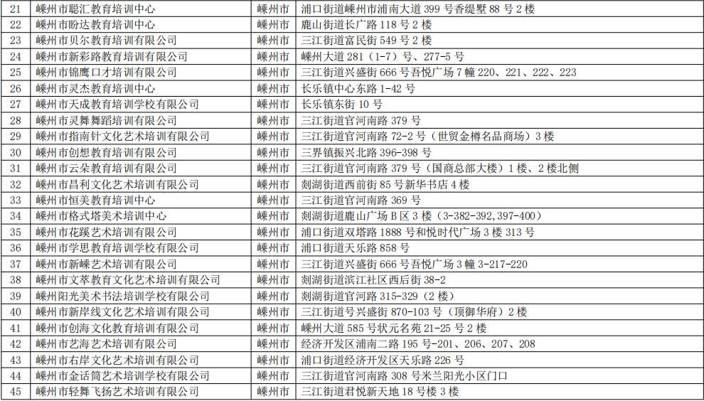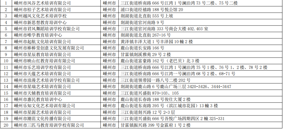 1月28日,紹興市教育局發(fā)布事關(guān)校外培訓(xùn)的溫馨提示。為進(jìn)一步規(guī)范校外培訓(xùn)行為,保障廣大家長(zhǎng)和學(xué)生的合法權(quán)益,近期,紹興市科技局、紹興市文廣旅游局和紹興市體育局陸續(xù)公布了最新的非學(xué)科類校外培訓(xùn)機(jī)構(gòu)“白名單”,其中嵊州市情況如下: