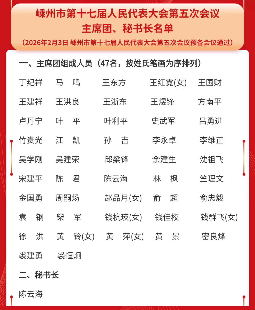 2月3日下午,市十七屆人大五次會(huì)議舉行預(yù)備會(huì)議。市人大常委會(huì)主任徐洪,副主任俞忠毅、竺理文、錢群飛、陳云海在主席臺(tái)前排就座。在主席臺(tái)就座的還有市人大常委會(huì)其他組成人員。