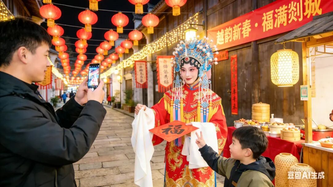 越劇NPC沉浸式互動(dòng):梁山伯、祝英臺等經(jīng)典越劇角色,搭配財(cái)神、福神喜慶出鏡,隨機(jī)穿梭街巷,唱越劇小段、教經(jīng)典身段,合影還送福字、春聯(lián),氛圍感直接拉滿~