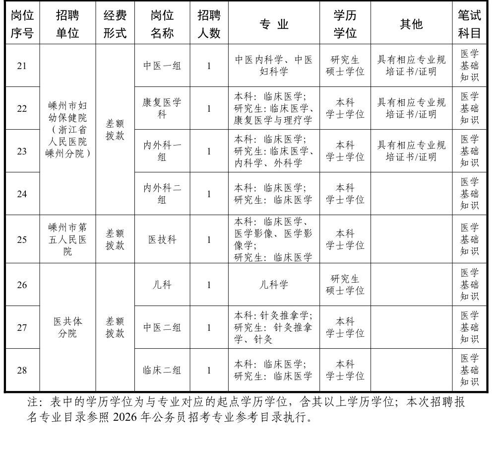 本次嵊州市衛(wèi)生健康局下屬事業(yè)單位計劃公開招聘工作人員31名,具體招聘單位、崗位、人數(shù)和應聘資格條件,詳見《2026年嵊州市衛(wèi)生健康局下屬事業(yè)單位公開招聘工作人員計劃表》(附件1)。
