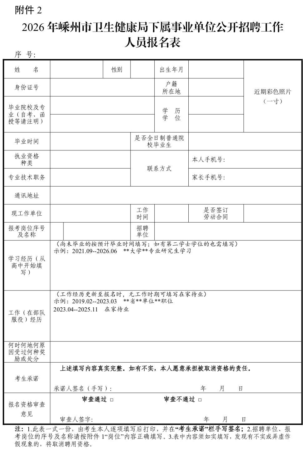 2.2026年嵊州市衛(wèi)生健康局下屬事業(yè)單位公開招聘工作人員報名表