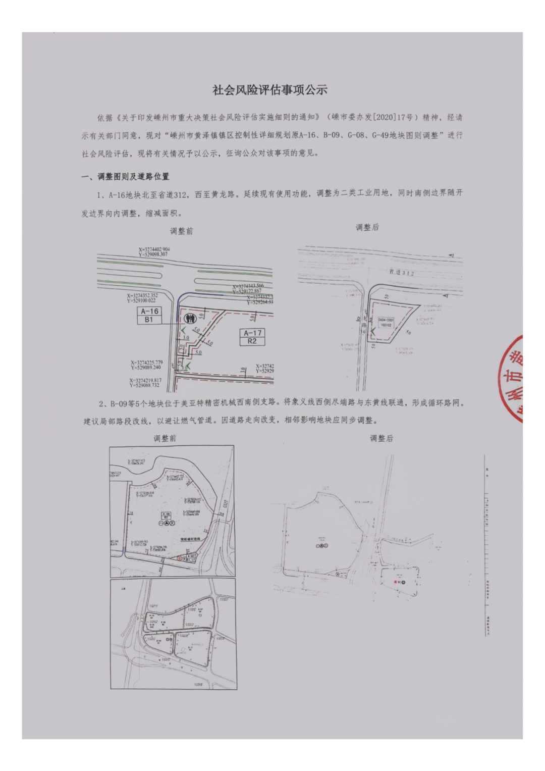 依據(jù)《關于印發(fā)嵊州市重大決策社會風險評估實施細則的通知》(嵊市委辦發(fā)[2020]17號)精神,經(jīng)請示有關部門同意,現(xiàn)對“嵊州市黃澤鎮(zhèn)鎮(zhèn)區(qū)控制性詳細規(guī)劃原A-16、B-09、G-08、G-49地塊圖則調整”進行社會風險評估,現(xiàn)將有關情況予以公示,征詢公眾對該事項的意見。