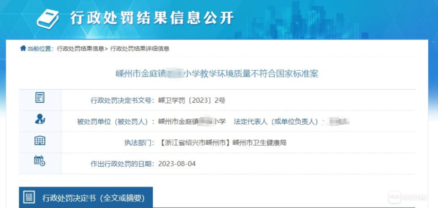 被處罰人:嵊州市金庭鎮(zhèn)**小學(xué),統(tǒng)一社會信用代碼:1****************Q現(xiàn)已查明:嵊州市金庭鎮(zhèn)**小學(xué)教學(xué)環(huán)境質(zhì)量不符合國家有關(guān)標(biāo)準(zhǔn)。當(dāng)事人的行為違反了《學(xué)校衛(wèi)生工作條例》第六條第一款,