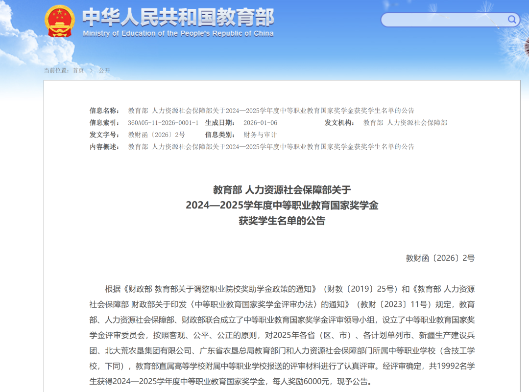近日教育部、人力資源社會保障部發(fā)布公告公布2024—2025學(xué)年度中等職業(yè)教育國家獎學(xué)金獲獎學(xué)生名單嵊州獲獎學(xué)生名單▼▼▼恭喜他們!嵊州市融媒體中心出品來源:教育部官網(wǎng)嵊州生活網(wǎng)友情轉(zhuǎn)載,版權(quán)歸原作者